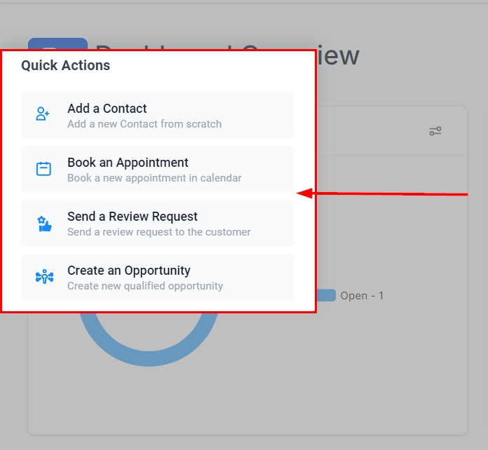 The Quick Actions section provides a set of tools for performing common tasks efficiently. You can quickly add a new contact, schedule an appointment, send a review request, or create an opportunity with just a few clicks. This feature streamlines the initiation of these tasks, reducing the need for extensive navigation.
