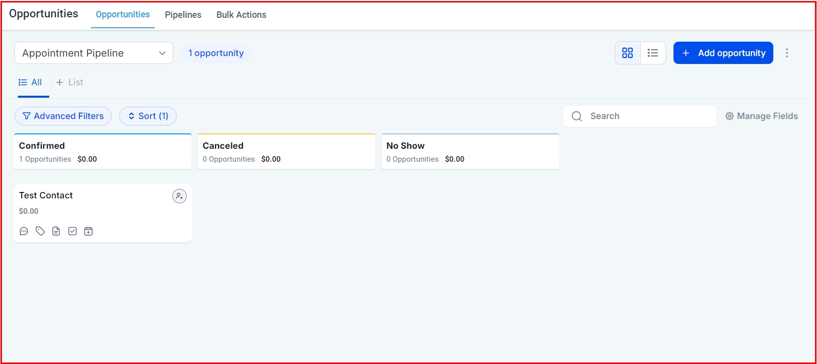 Located below the drop-down menu, the search bar allows you to quickly find and manage specific contacts by entering their names. Additionally, you can use the search bar to add opportunities or view payment information related to the selected contact.