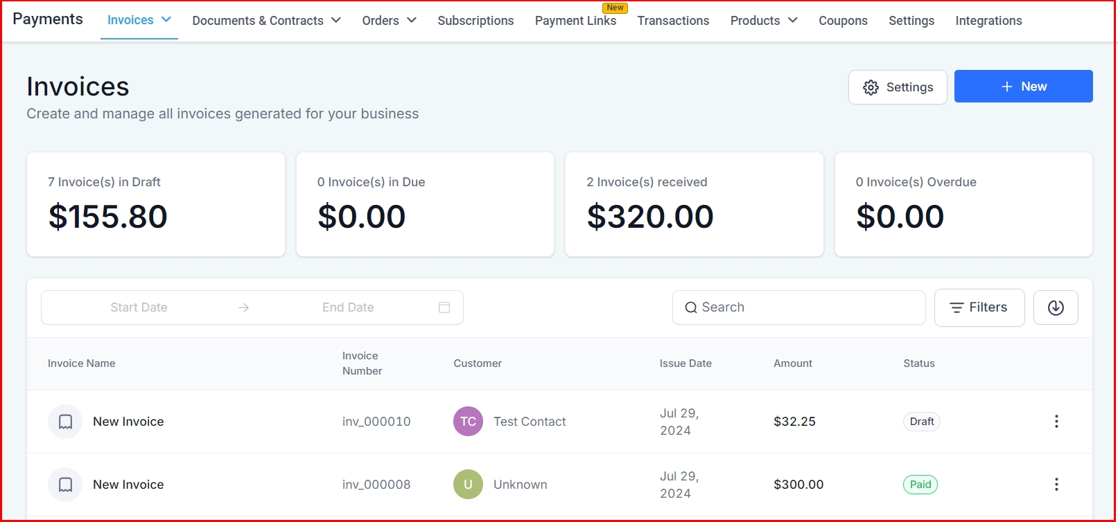 To explore these options, go to "Payments" from the sidebar menu, where you’ll find the Invoices, Documents & Contracts, Orders, Subscriptions, Payment Links, Transactions, Products, Coupons, Settings, and Integrations tabs.