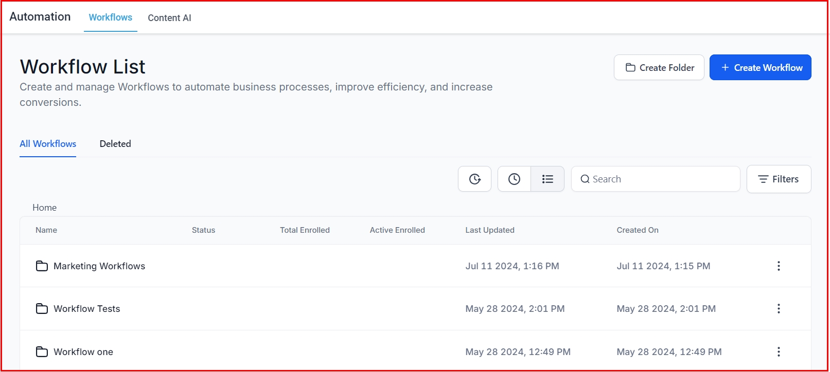 Navigate to "Automation" from the sidebar to access the Workflows and Content AI tabs.