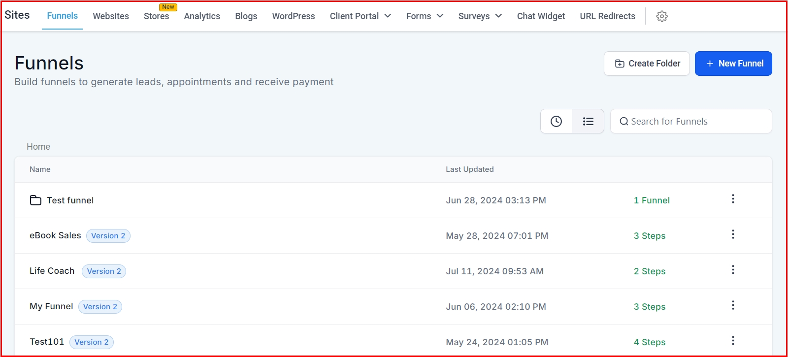 Access these tools by selecting "Sites" from the sidebar menu, where you’ll find the Funnels, Websites, Stores, Analytics, Blogs, WordPress, Client Portal, Forms, Surveys, Chat Widget, and URL Redirects tabs.