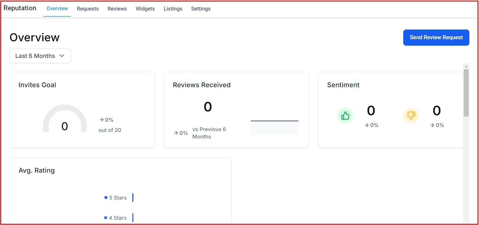 The Reputation section helps you manage your online reputation by providing an overview of reviews and review requests. It includes tabs for sending review requests, responding to reviews, and managing business widgets and listings.