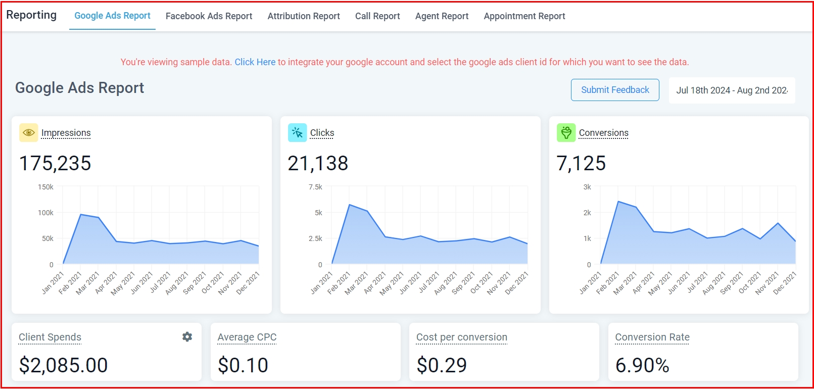 The Reporting section offers detailed insights and analytics on your marketing campaigns and business activities. Tabs within this section include: