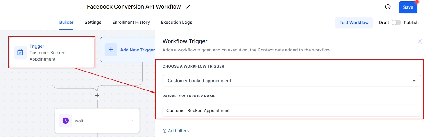 The Test Workflow button might seem convenient, but it doesn’t provide the most accurate results for Facebook CAPI workflows. Instead, replicate real user interactions by using live triggers, such as submitting a form or booking an appointment. Testing this way ensures the workflow behaves as intended in real-world scenarios.