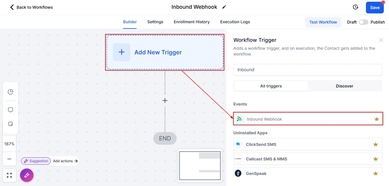 Start by clicking on +Add New Trigger, in the side menu search for and add Inbound Webhook as your trigger.