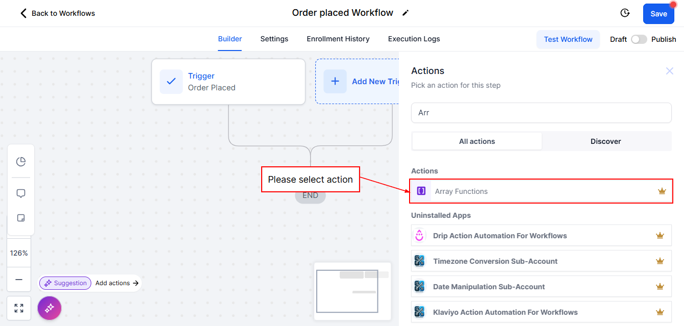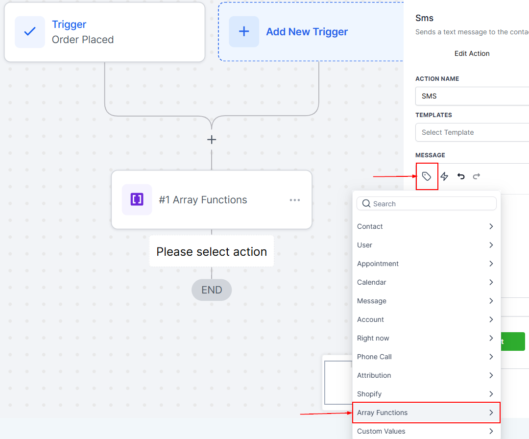 In the workflow, add a suitable Trigger. In this demo, we are using the Shopify Order Placed trigger. Click the “+” icon, then in the actions menu, search for and add "Array Functions" to the workflow.