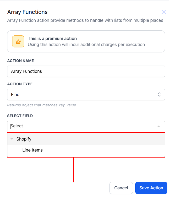 The Array Functions Premium Action is a powerful tool that enables users to locate and manipulate array data efficiently. Whether you’re handling Shopify order line items or webhook triggers, this action simplifies the process of extracting useful information.