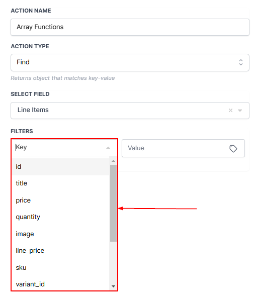 Here is the list of key variables from the selected array field. In this example, the list of Shopify line items' key variables is also included.