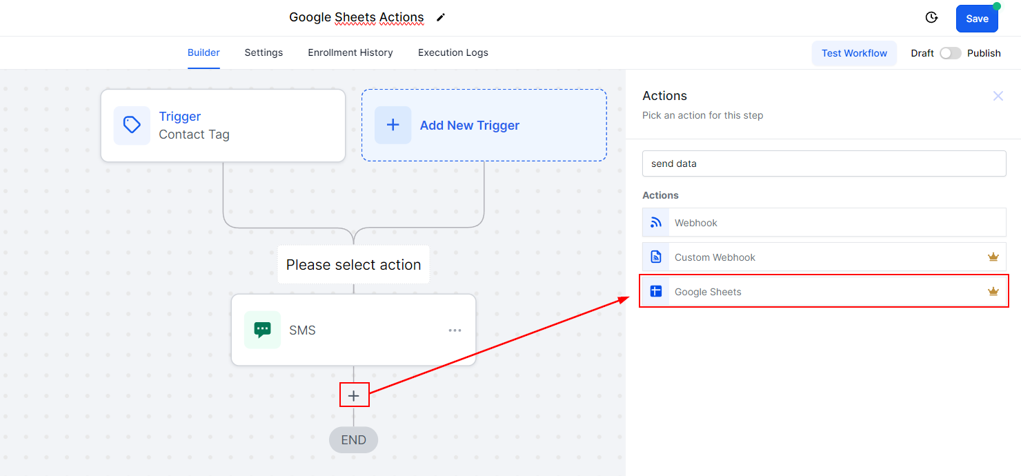 Inside the Workflow Builder click the + Sign button to open the action menu the actions will be under the Send Data category.