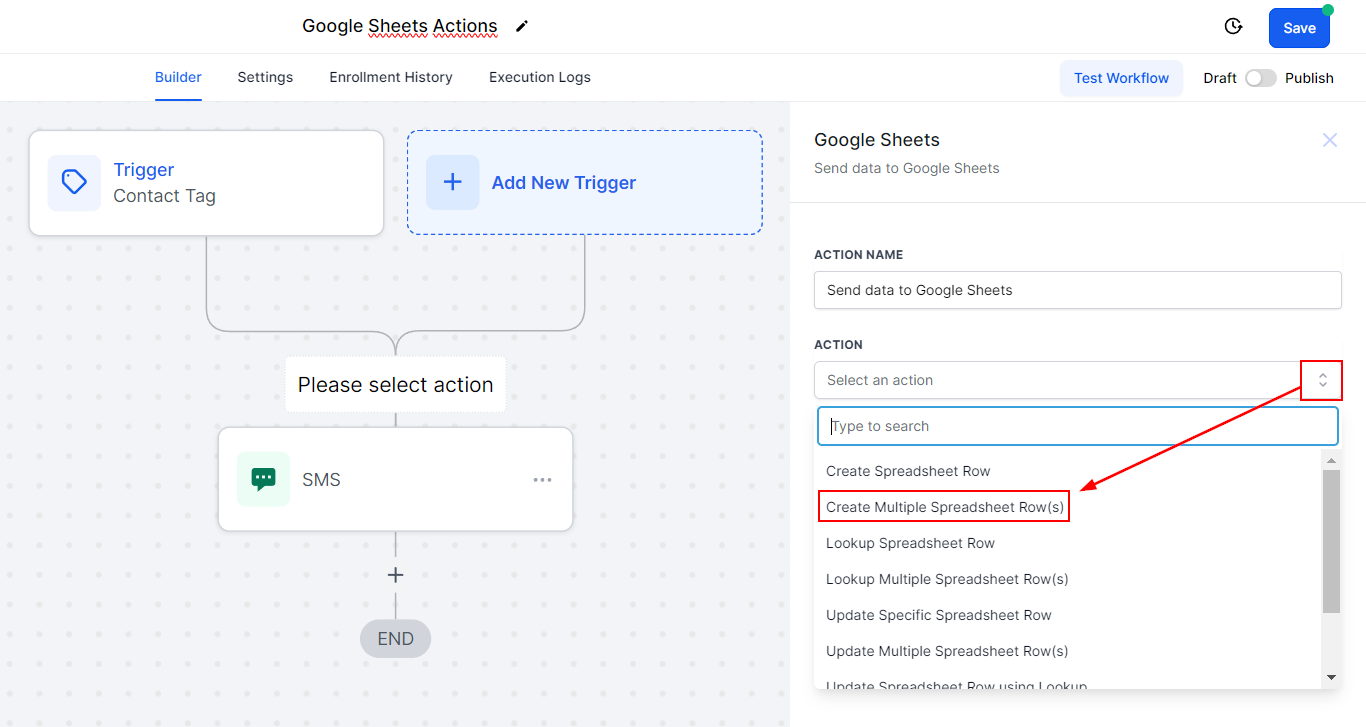 Once you've selected the action open the drop-down menu and select Create Multiple Spreadsheet Row(s)