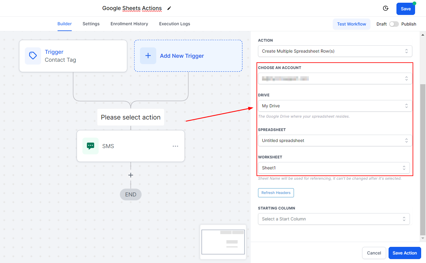 You'll be required to select an account, drive, spreadsheet, and worksheet to send the data to.