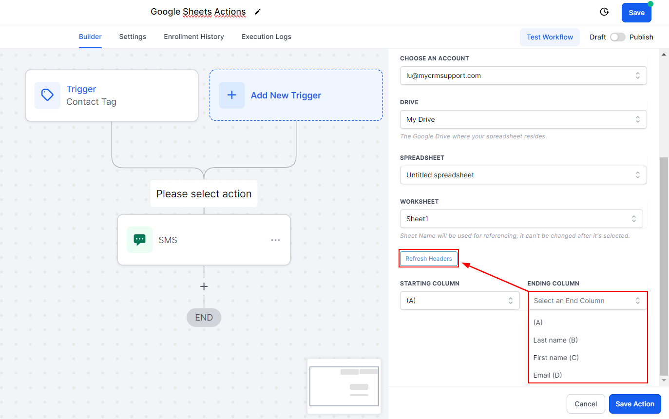 Choose a starting and ending column, header names will be displayed but if you see any discrepancies click “Refresh Headers” to fetch the latest data.