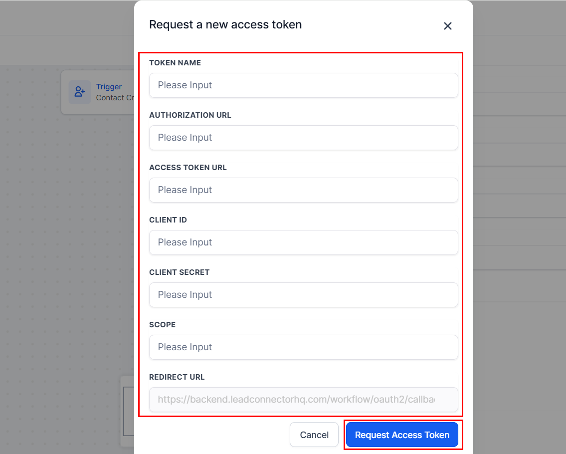 To request a new access token, complete the fields in the popup modal, then confirm by clicking the Request Access Token button.