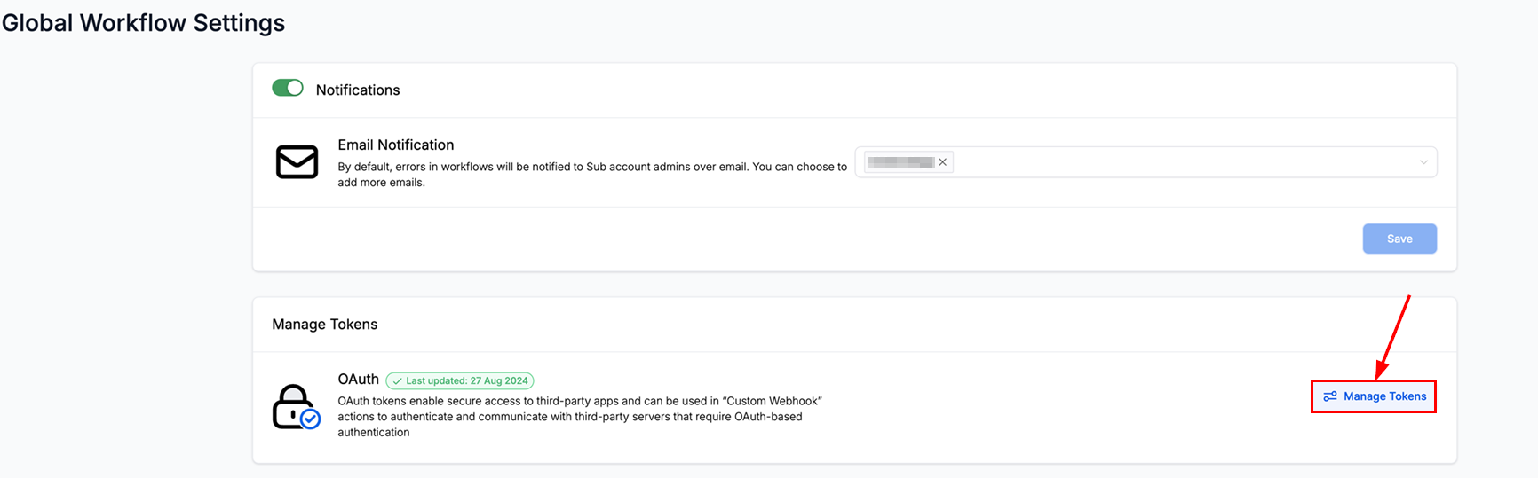 Tokens can be managed within the Custom Webhook action or in the Global Workflow Settings.