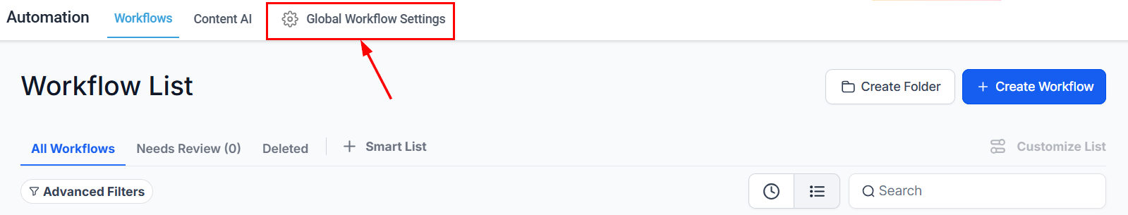 Alternatively, head to the Global Workflow Settings from the main Workflows screen.