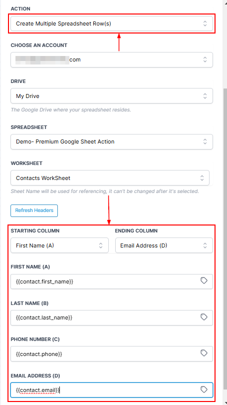 The Create Multiple Spreadsheet Rows action allows you to insert multiple rows into your Google Sheet at once. This is especially useful when dealing with bulk data, such as importing a list of contacts or records from another source. By specifying starting and ending columns, you ensure that only the relevant data fields are populated, reducing errors and maintaining a clean sheet structure.