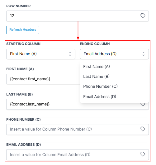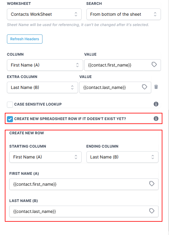 Within the Create Spreadsheet Row action, choose the columns where you want to add or update data. If you want your data to be flexible and adaptable, you can also use special names.