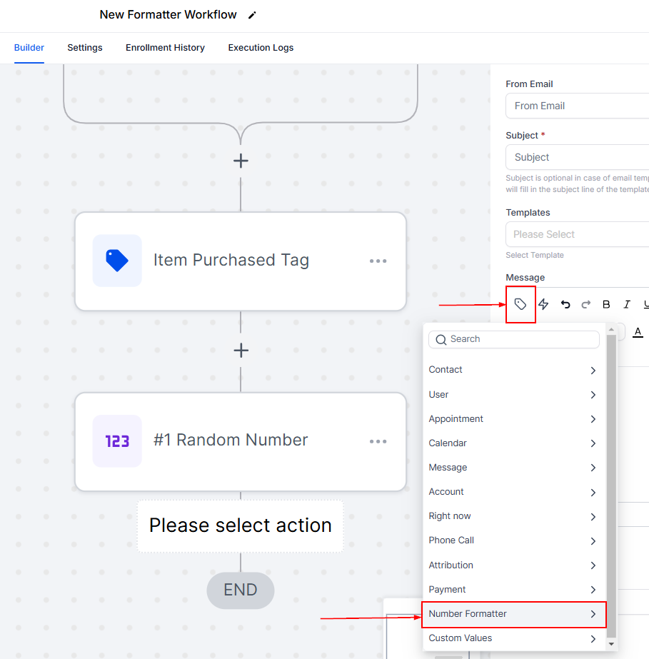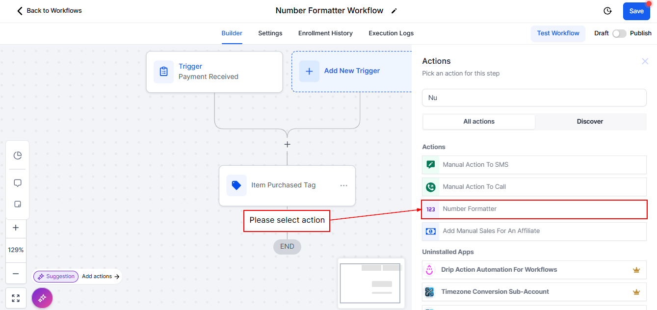 In the workflow, add a suitable Trigger, click the “+” icon, then in the actions menu, search for and add "Number Formatter" to the workflow.