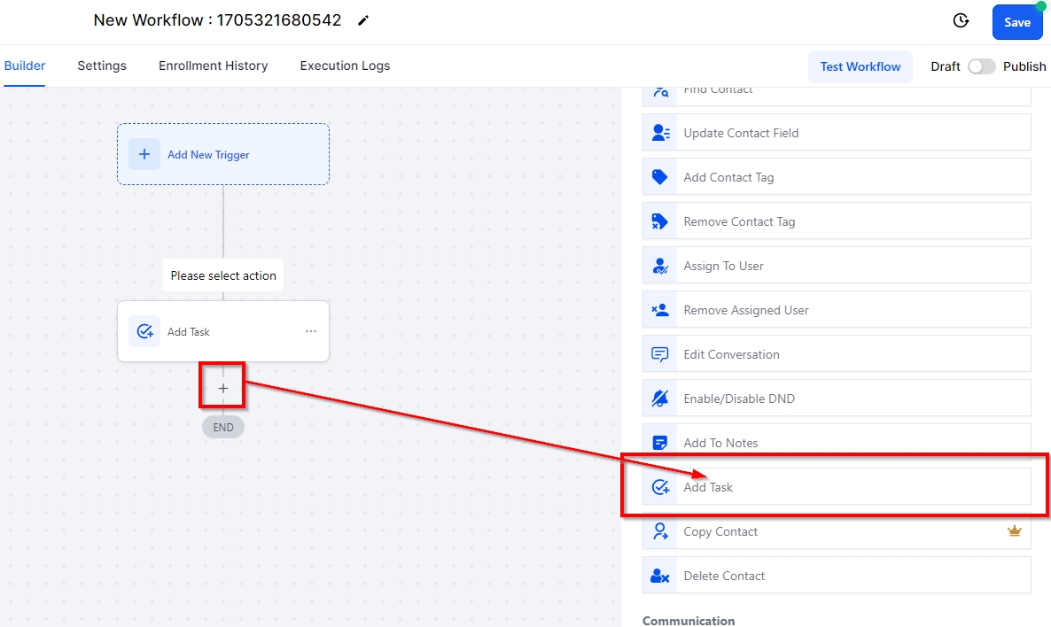 The Add Task workflow action in your CRM enables users to assign a task to themselves or their team members. The task can only be assigned to an active user within the account. This workflow action allows you to automate task creation for your team members to remind them to complete important tasks such as setting up follow-up sales calls.