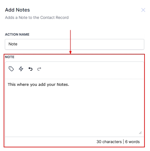 In the Add To Notes action, simply enter the Note in the designated field, which can be used to provide information that could be beneficial to other users assigned to that contact.