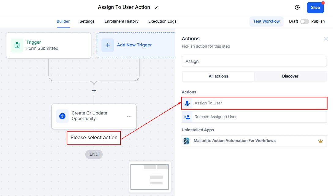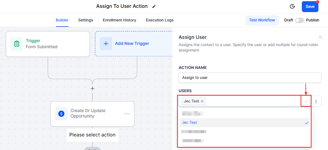 With the Assign to User action, you can efficiently manage contact assignments within your workflows, ensuring a balanced and flexible approach for your team. Whether using single-user assignments, round-robin rotations, or customized traffic splits, this feature keeps your workflow adaptable to your needs.