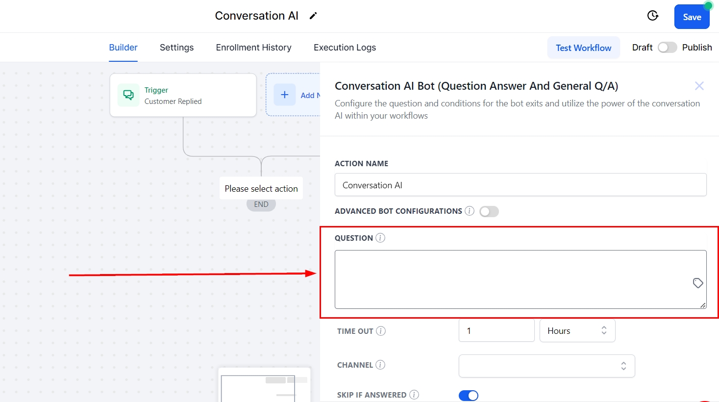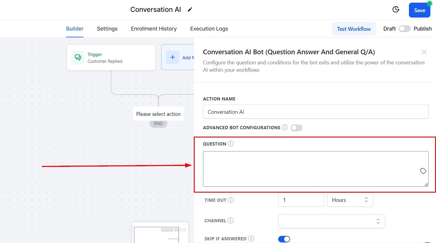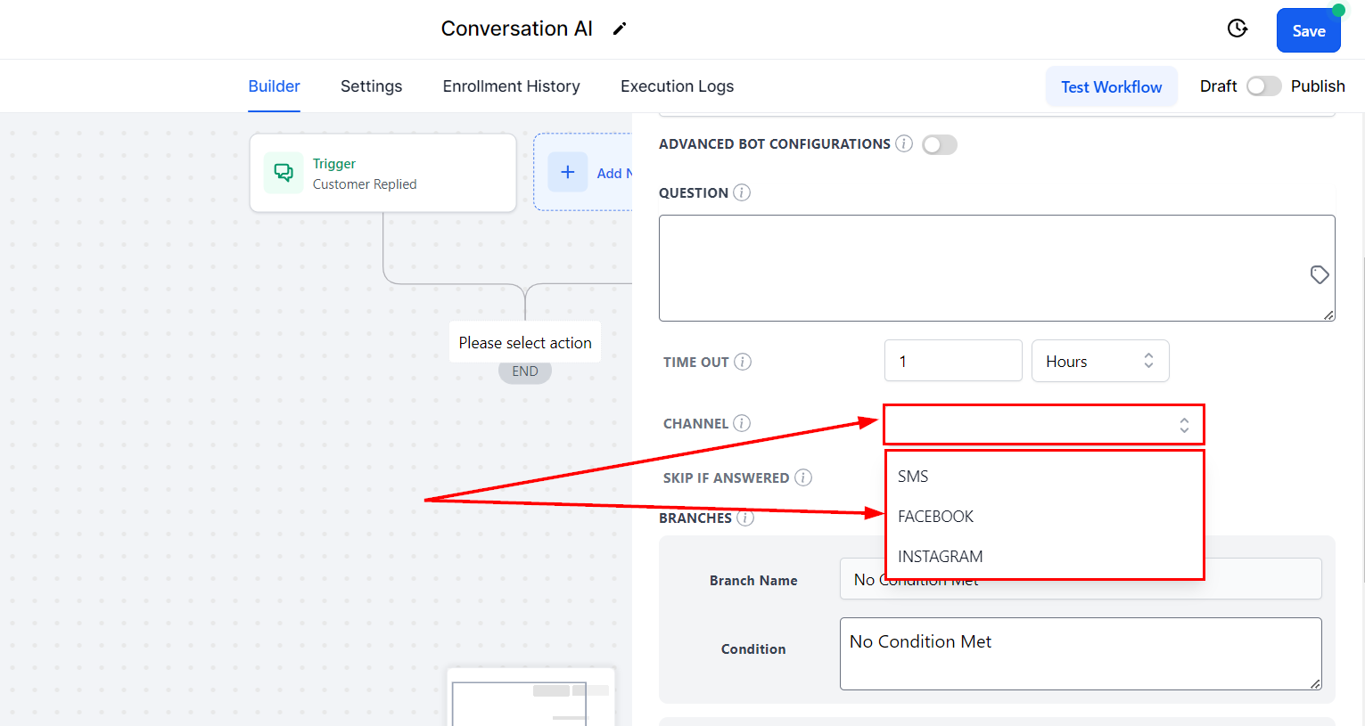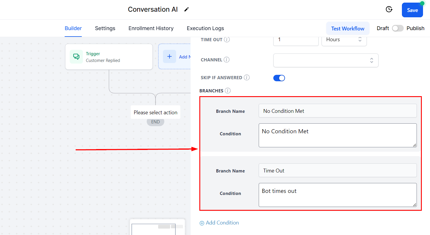Specify the time frame in which the bot should wait for a response from the contact. When the contact fails to reply in the allotted time, the workflow automatically follows the Time Out branch, enabling you to implement follow-up actions or alternative steps to ensure continued engagement and effective workflow management.