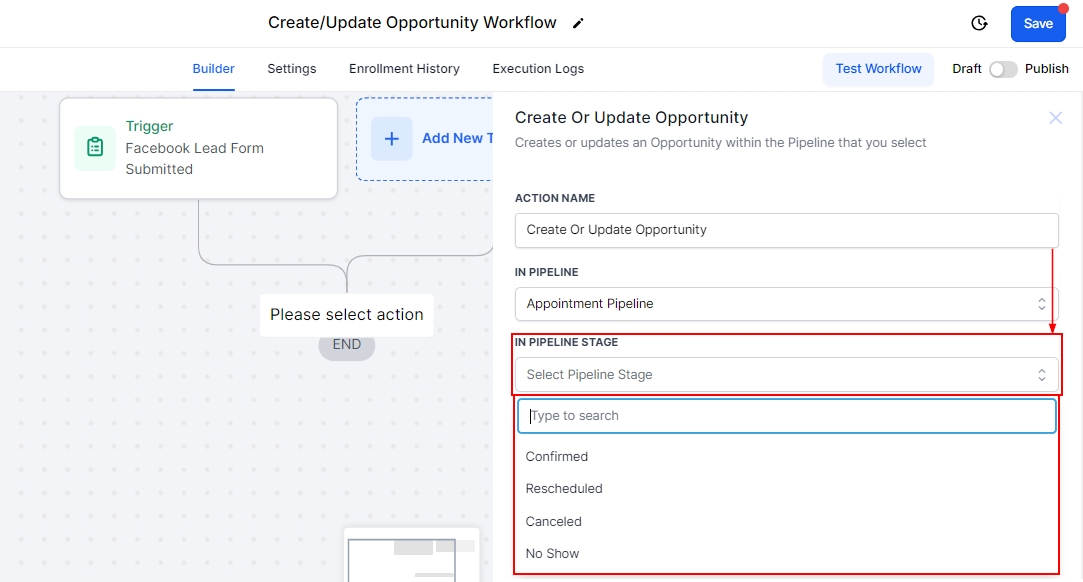 The Create/Update Opportunity workflow action allows you to create a new opportunity or update an existing one in the pipeline you select. This workflow action allows you to automate opportunity status changes based on a workflow trigger, getting rid of manually moving contacts to new opportunities.