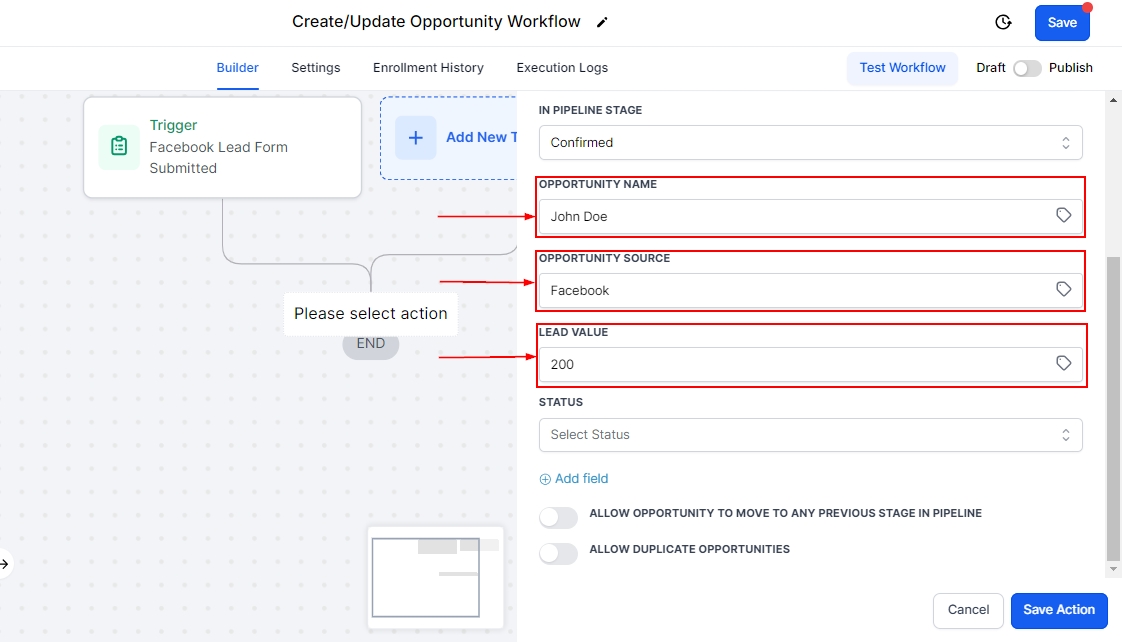 The Create/Update Opportunity workflow action simplifies and automates opportunity management, allowing you to track, update, and customize opportunities seamlessly. By using this feature, you can maintain an organized and efficient pipeline that adapts to your unique business processes.