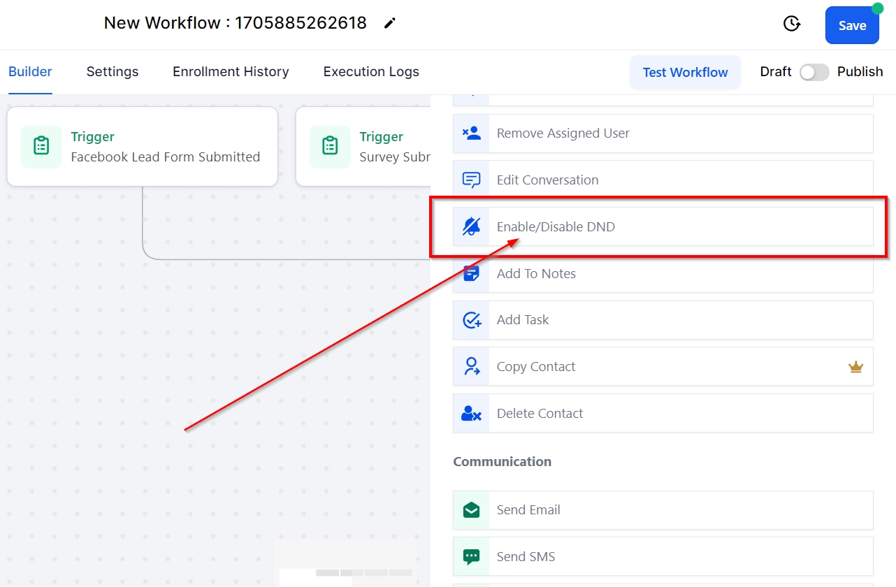 To enable the Do-Not-Disturb feature for a contact, users should opt for the Set Contact DND workflow action.