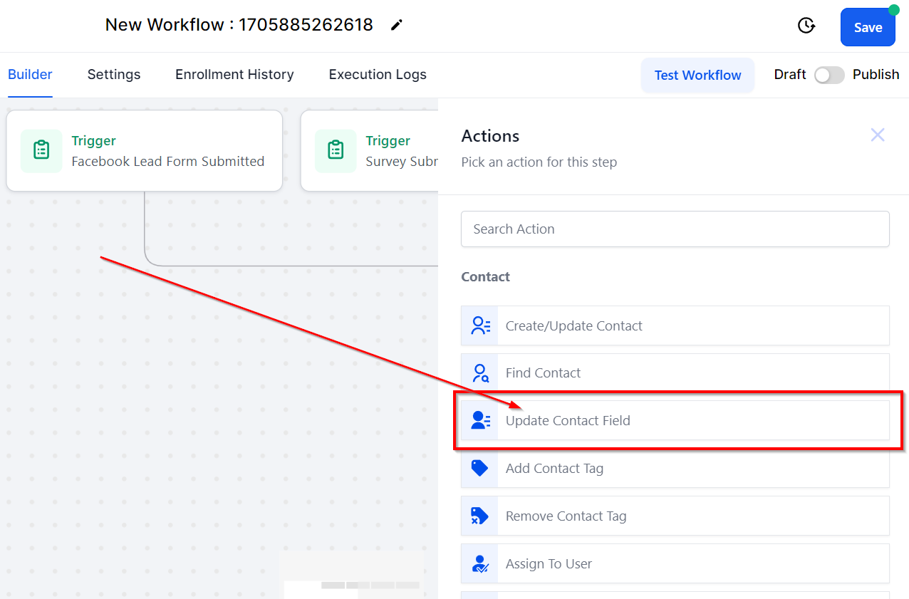 The Update Contact Field workflow action empowers users to make alterations to a specific field within a contact's record. This feature facilitates the efficient management of contact information by allowing users to easily update or correct details as needed.