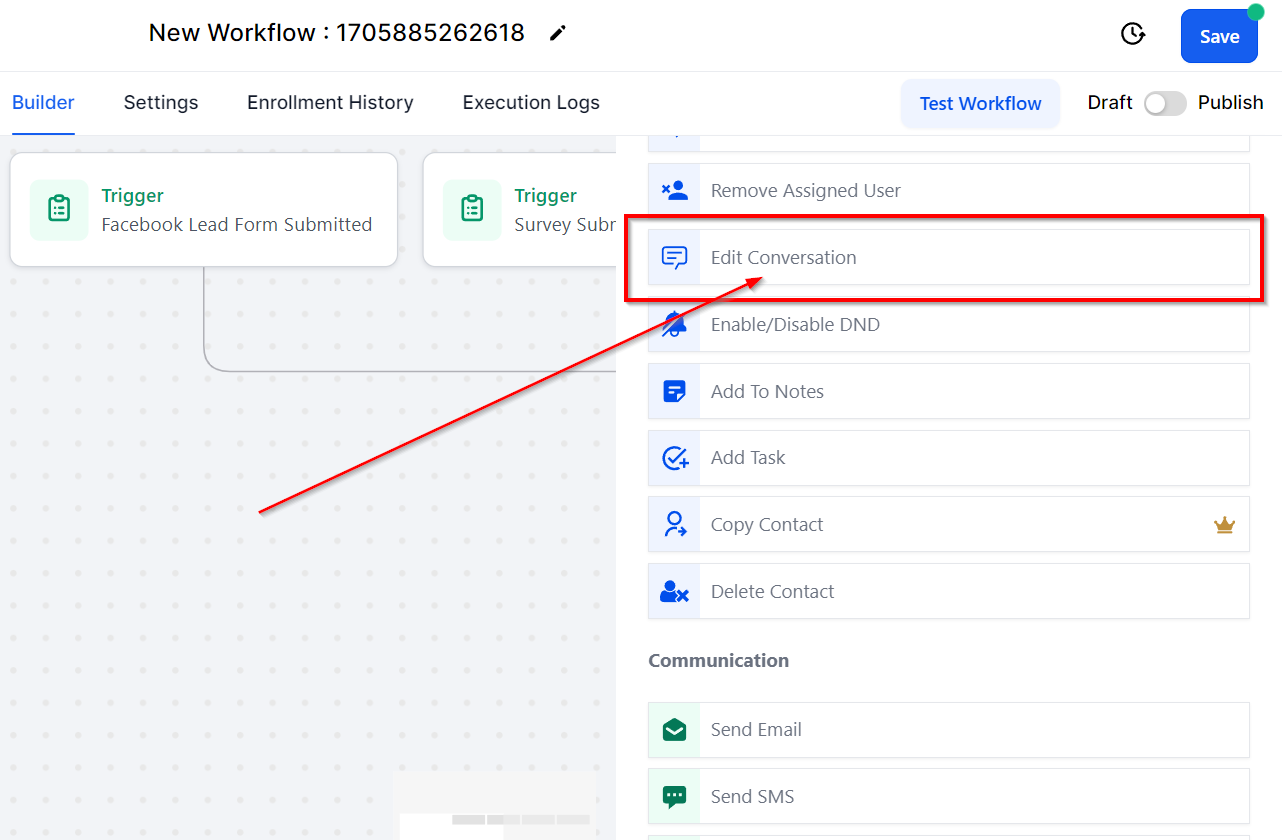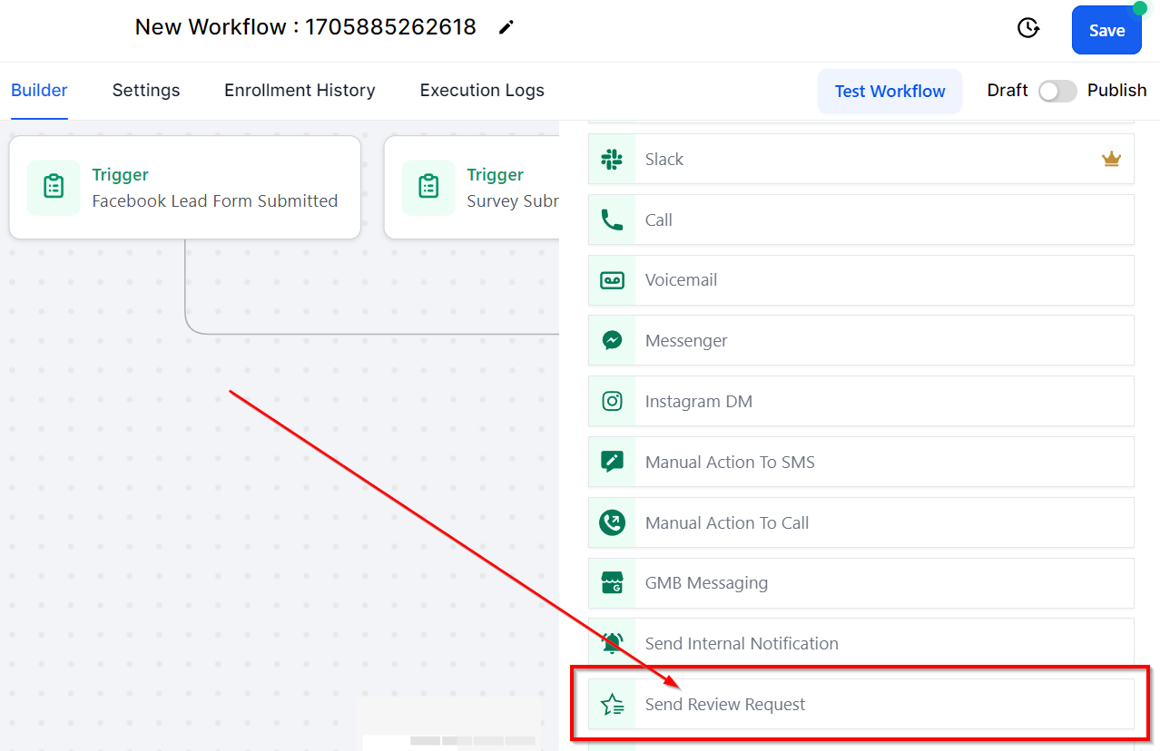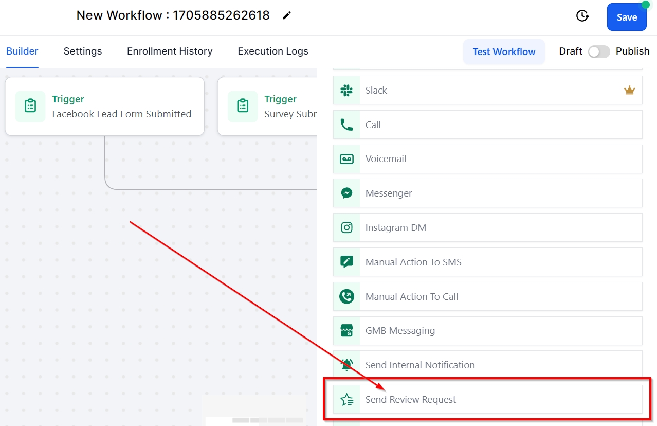 When building workflows and adding workflow actions, you will notice a category called CRM Actions. This category includes actions that will complete specific actions within your CRM, such as adding/removing tags, updating opportunities, removing from workflows, sending review requests, and more!