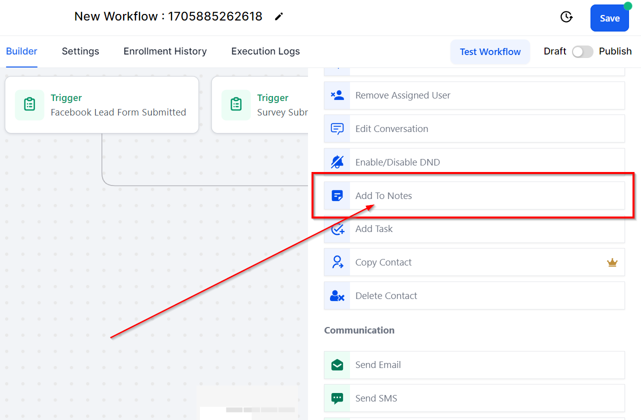 Additionally, the Add to Notes workflow action facilitates adding a note to the contact record. By entering the note in the specified field, you can supply valuable information for other users assigned to that contact.