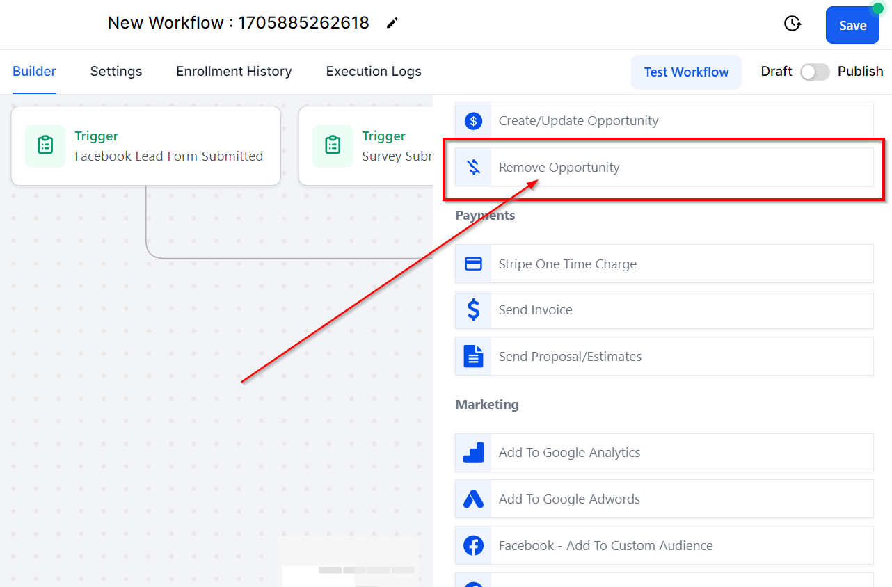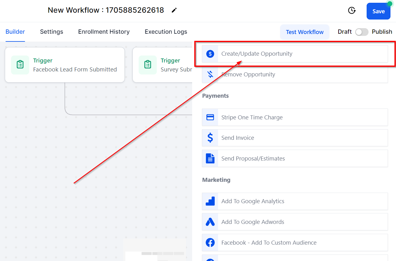 The Add/Update Opportunity workflow action permits you to either create a new opportunity or modify an existing one in your chosen pipeline. This workflow function enables automatic updates to opportunity statuses based on a specific workflow trigger, eliminating the need for manual transfers of contacts to new opportunities.