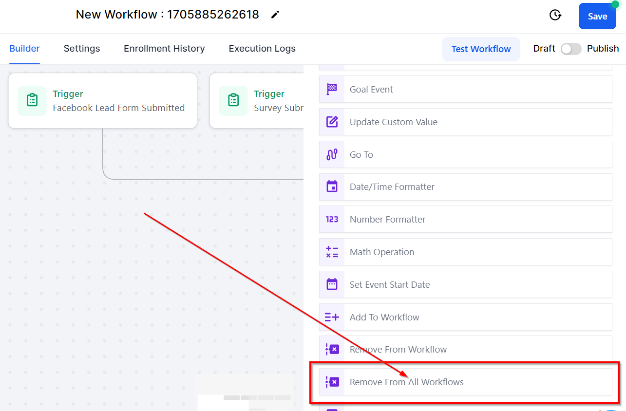 Additionally, the Remove From All Workflows action serves to withdraw a contact from all the workflows they are currently part of. By employing this action, users can eliminate a contact from all workflows, encompassing the one they are presently constructing, by selecting the Include Current Workflow option.
