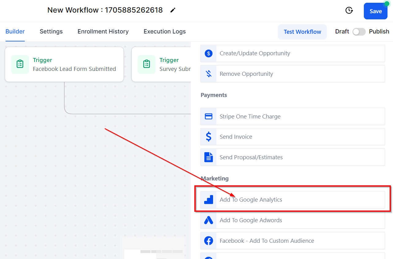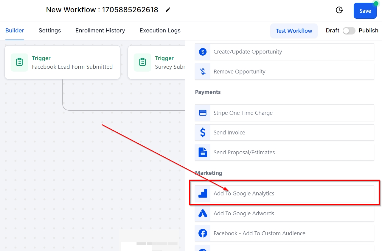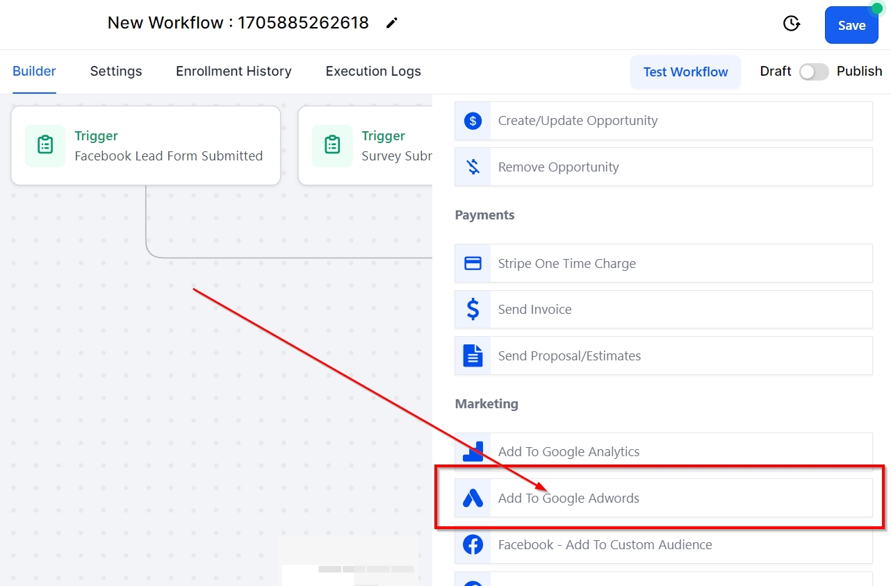 Additionally, the Add to Google AdWords action activates a conversion event in Google Ads. To utilize this workflow action, ensure that your Google Ads account is linked in the CRM's Integrations section found under Settings. Employ this workflow action to include leads in Google Ads when they perform an action like completing a form/survey, making a call, or finalizing a purchase.