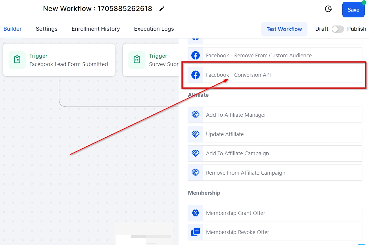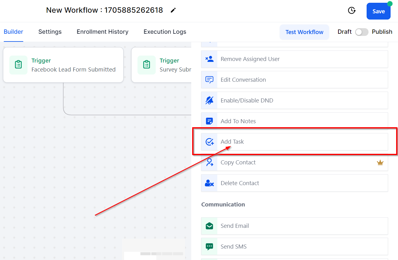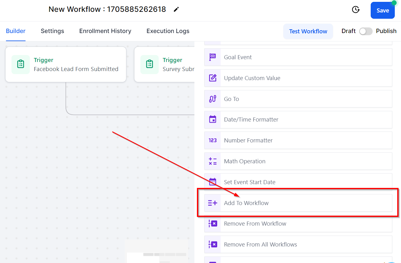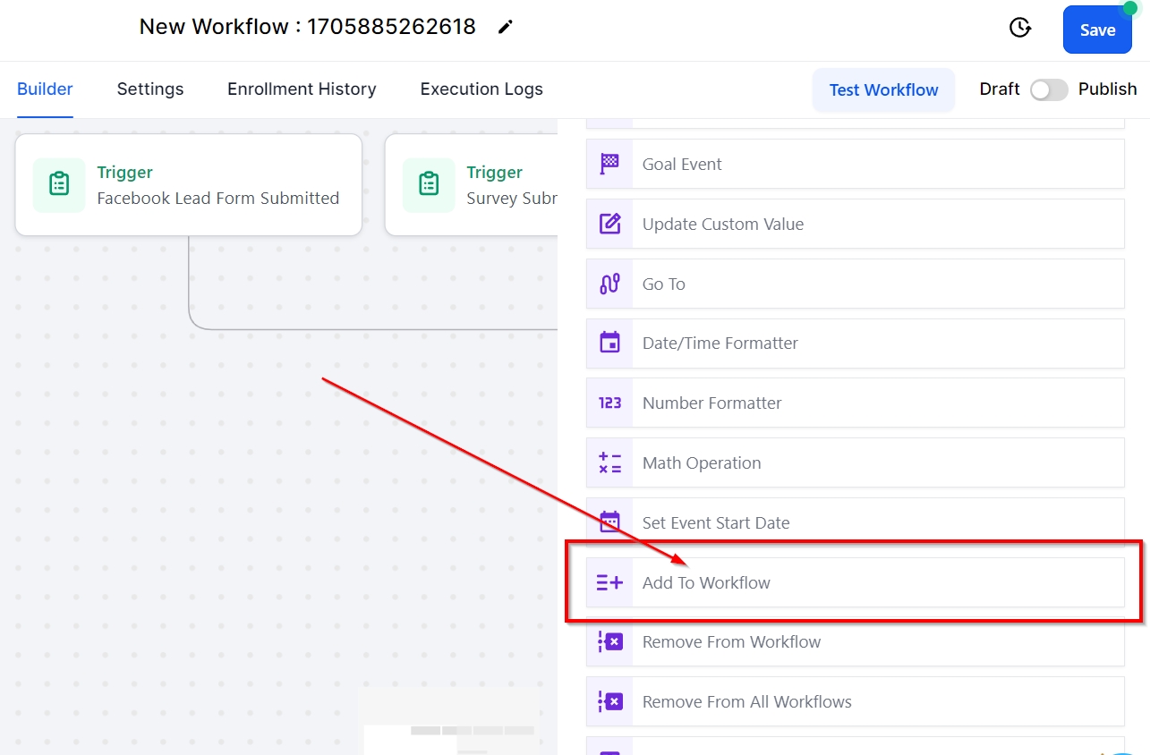 The Add to Workflow action allows users to include a contact in another workflow while in their current workflow. This workflow action proves helpful in adding a contact to another workflow once they have reached a specific step in the current workflow, facilitating smooth transitions.