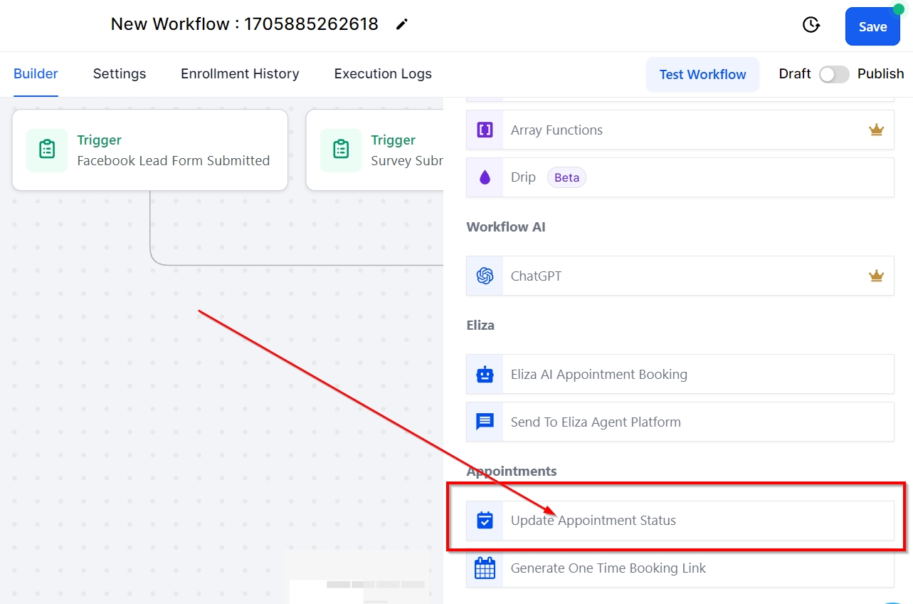 The Update Appointment Status workflow function enables users to modify an appointment's status. When a contact is included in the workflow through an appointment-related trigger like Appointment or Customer Book Appointment, the respective appointment's status is updated. On the other hand, if a contact is incorporated using a different method, the status of their latest scheduled appointment will be updated.