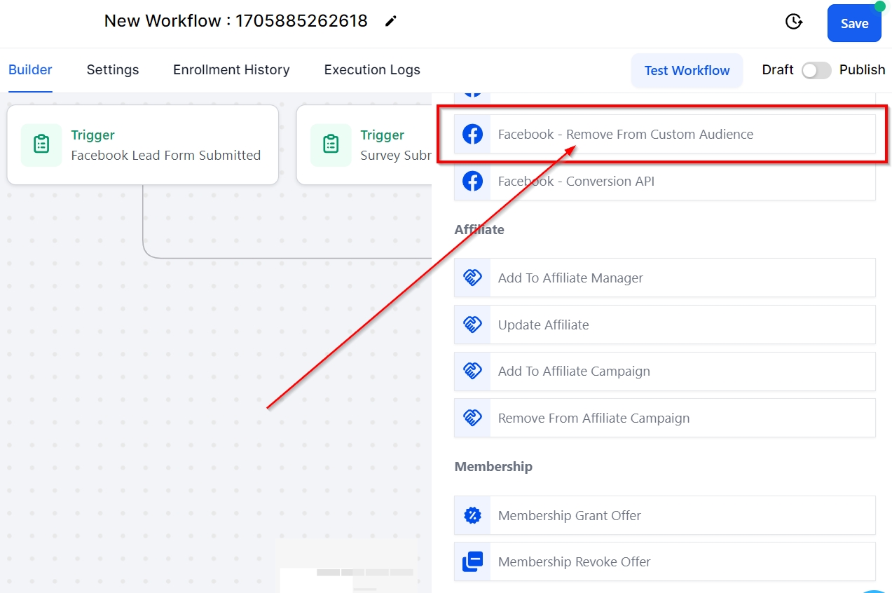 The Remove from Custom Audience workflow action enables users to remove contacts from a specified custom audience within the platform. This functionality allows for better management of audience segments by providing the option to exclude specific contacts based on certain criteria or actions.