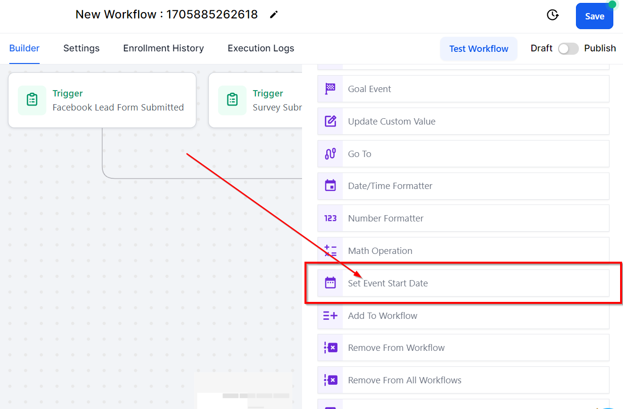 The Set Event Start Date workflow action empowers users to define the day, date, and time for the event's commencement. This facilitates the utilization of Wait events that retain contacts relative to the established day, date, and time.