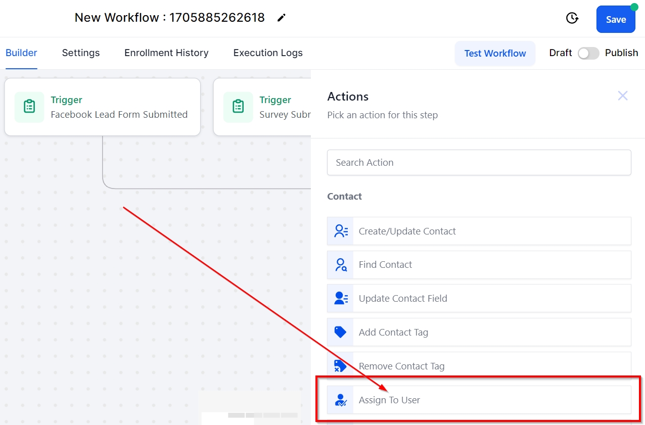 The Assign to User action is tailored to allocate the identified contact to a particular user or multiple users employing a round-robin assignment approach. Make use of this workflow action to delegate the entire workflow or particular actions within it to one or more team members, allowing for efficient monitoring.
