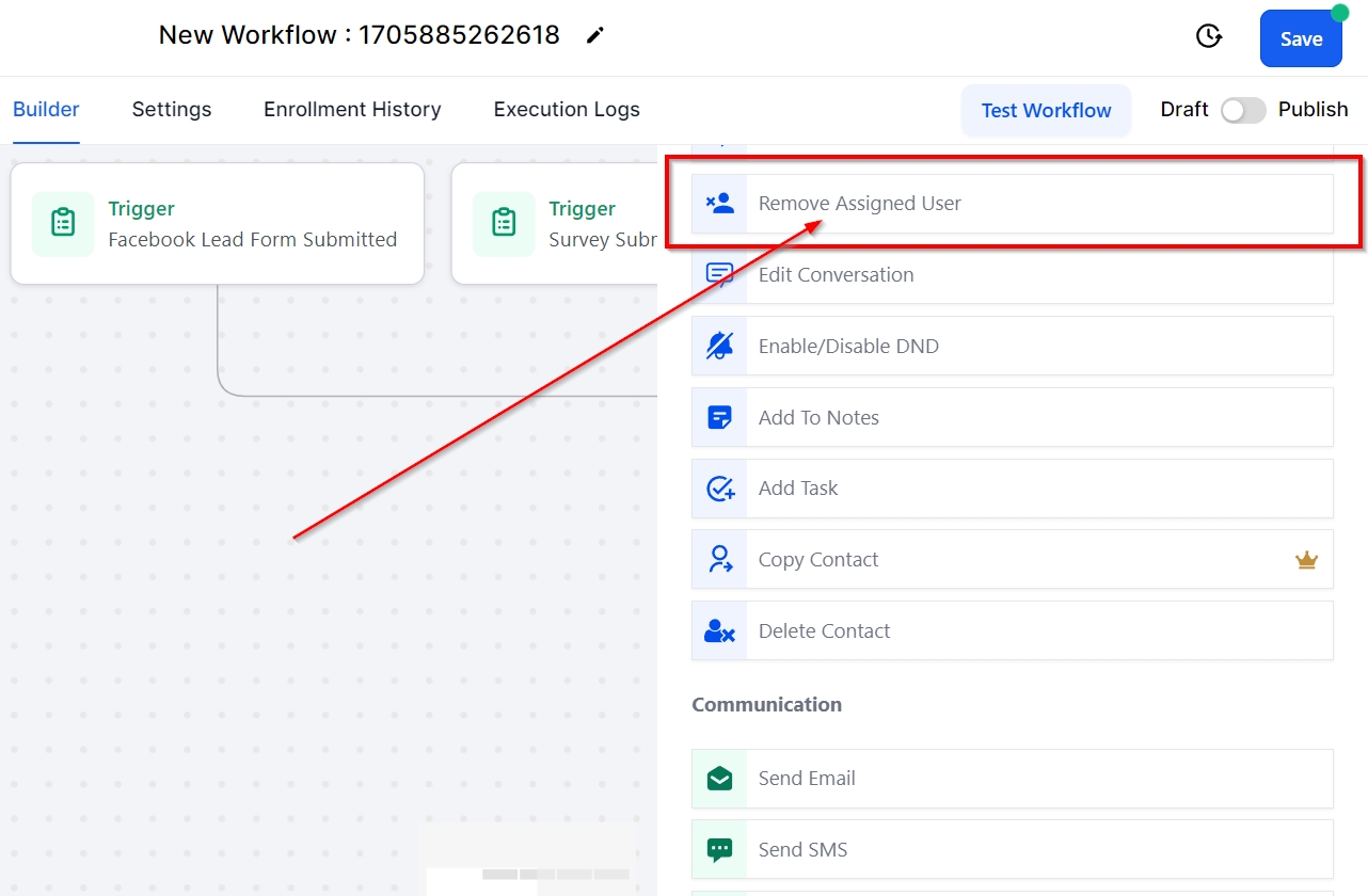 On the other hand, the Remove Assigned User workflow action eliminates an assigned user from a contact. This workflow action is ideal for use following the completion of an event, such as a manual SMS or Call by a team member. Effortlessly unassign users and save time with this automated process!