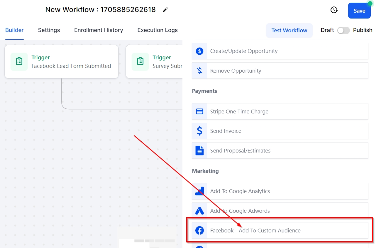 The Add to Custom Audience workflow function adds a contact to a specific custom audience on Facebook. This workflow function enables you to include contacts in a tailored audience for retargeting purposes, either when they have not yet become leads or to re-engage them following a purchase with your products/services.
