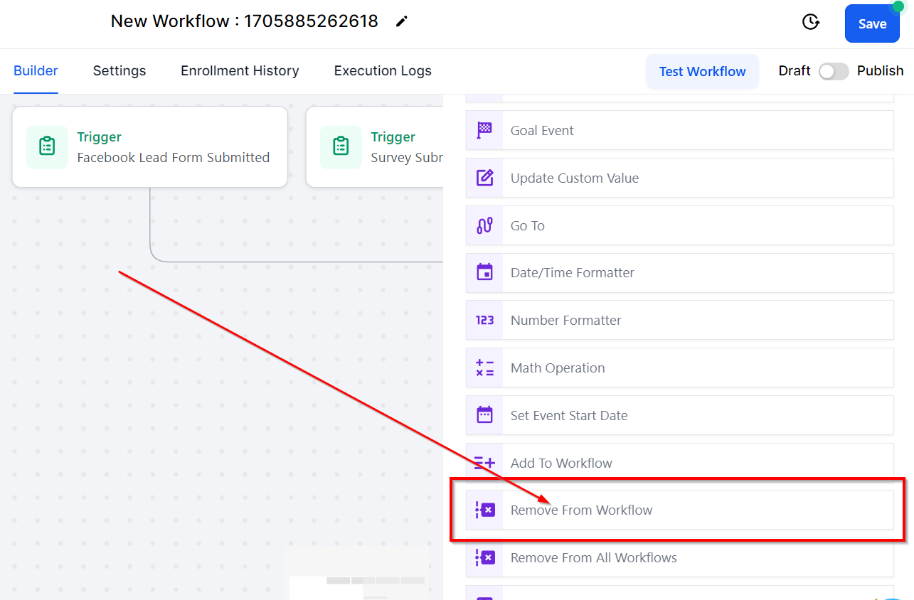 Conversely, the Remove From Workflow action is activated when there is a need to extract contacts from a specific workflow. There are two alternatives: (1) enabling the Current Workflow filter allows users to remove contacts from the workflow they are presently working on, and (2) activating the Another Workflow filter lets the user select the exact workflow they wish to remove the contact from among the available workflows in their CRM.