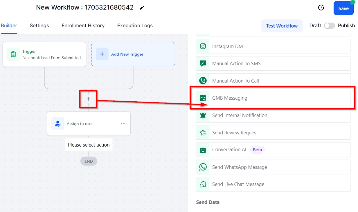 The GMB Message workflow action in your workflow enables you to send messages to your contacts via Google My Business. However, to ensure successful delivery, the contact must have messaged a GMB page that is connected to your CRM within 24 hours before the event.