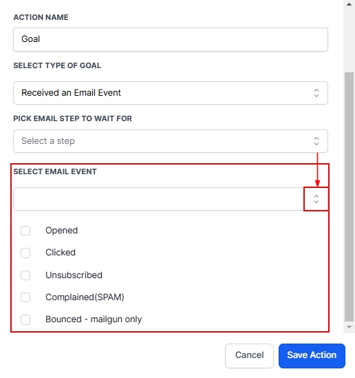 From the options below you can select the email event depending on your objective. From the checkboxes, you can select one or more events as per your goal.