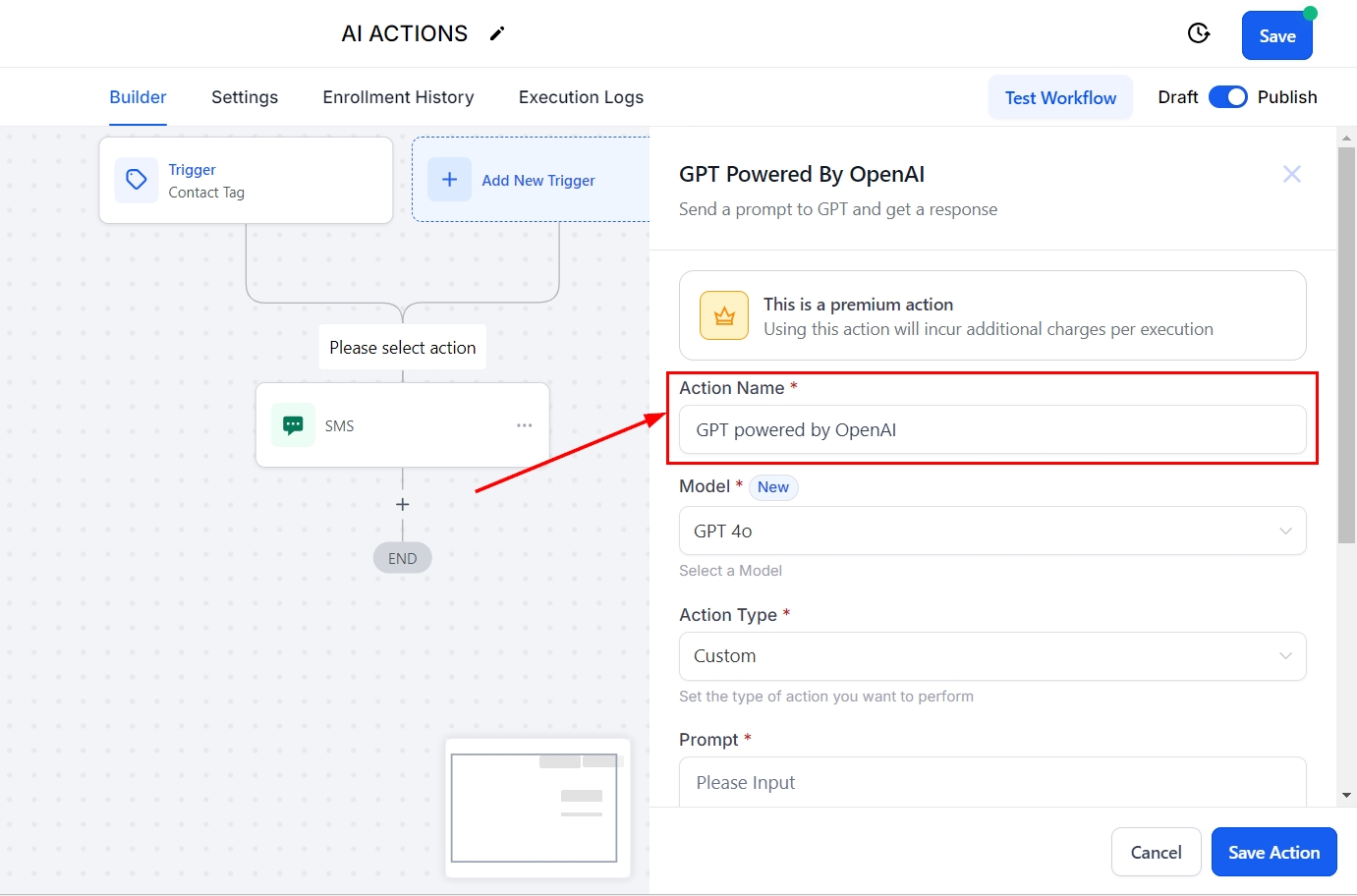 By combining the power of the GPT powered by OpenAI Action with other Workflow actions and Triggers, you can create intelligent and dynamic workflows that automate processes, personalize interactions, and streamline your business operations.