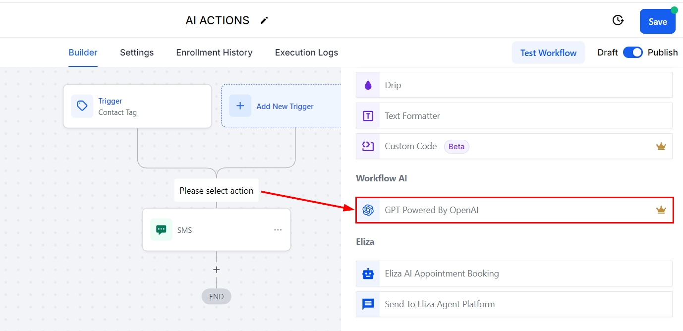 Create a workflow or open an existing workflow to begin. Add an appropriate Workflow Trigger, then add the GPT powered by OpenAI Action.