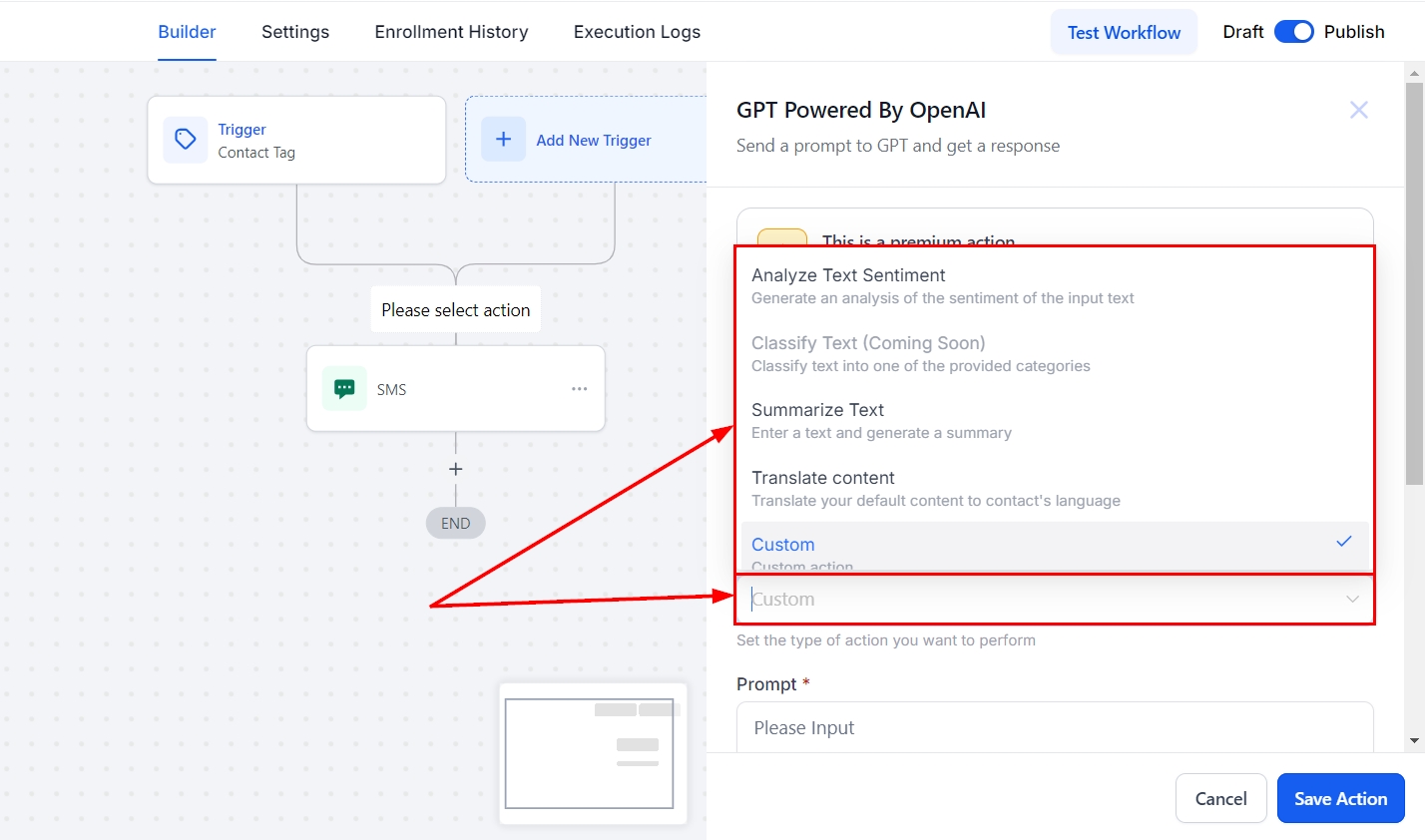 Custom: For custom actions, enter a Prompt by typing in this section or using custom fields so the necessary content can be generated.