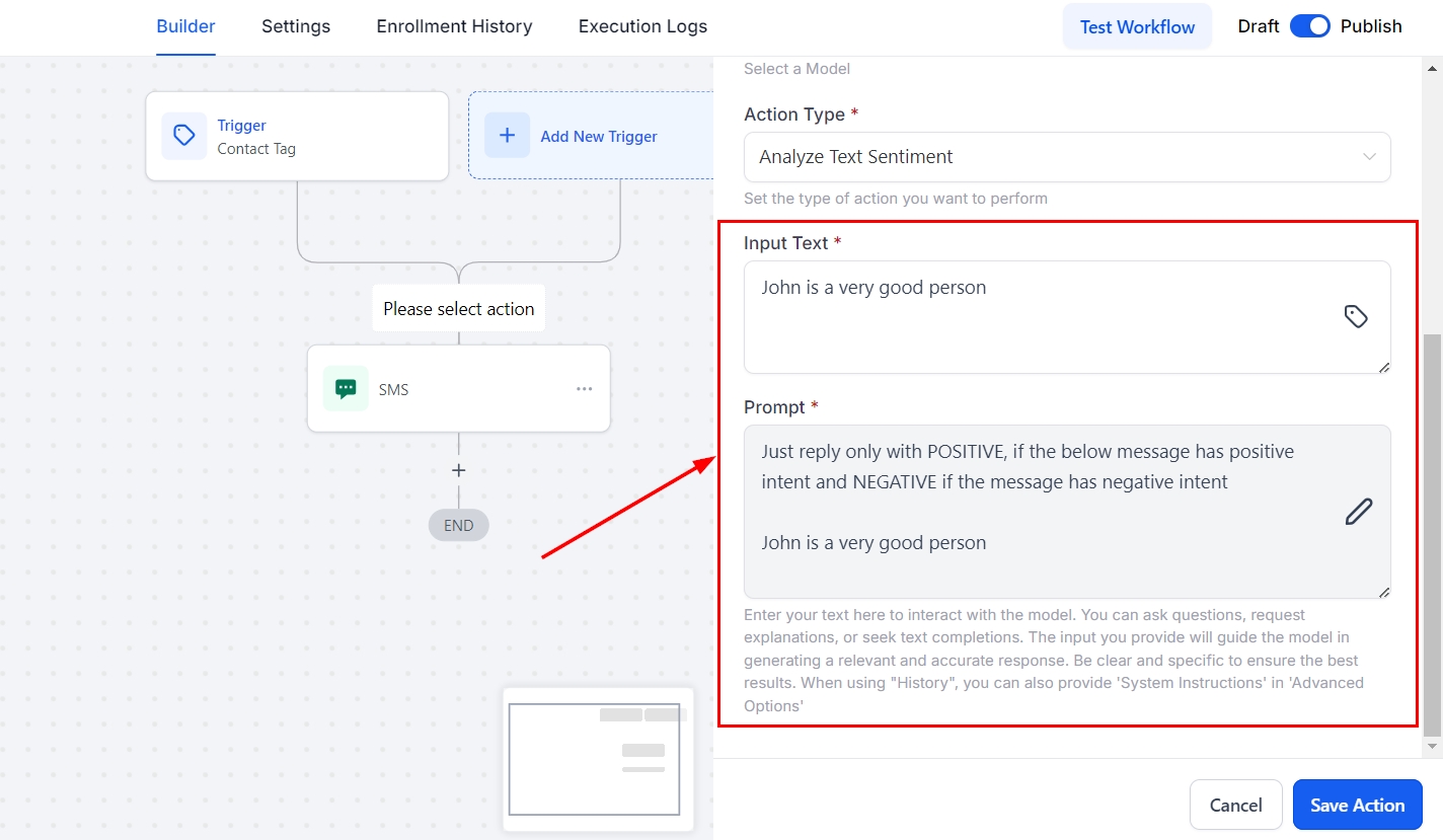 Analyze Text Sentiment: Assess whether the received message has positive or negative intent and take appropriate action based on the analysis. Use custom fields for further customization of the input text or start typing directly into the field to modify the input. If you alter the prompt, the action type will automatically update to Custom.