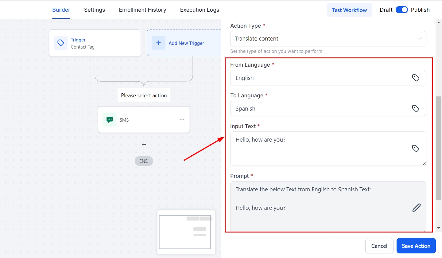 Translate Content: Select the from and to language for translation. Use custom fields for further customization of the input text or start typing directly into the field to modify the input. If you alter the prompt, the action type will automatically update to Custom.